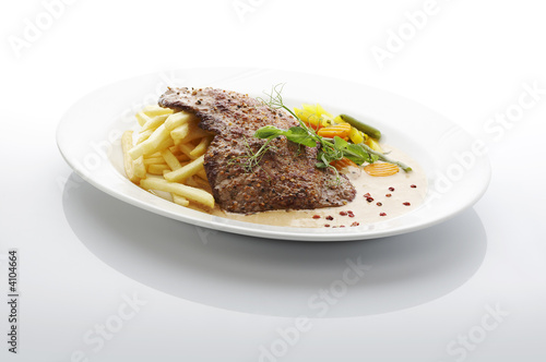 food, meal, meat, steak, french, fries, french fries, vegetable, carrot, pepper, veal, grill, bar-b-q, bar-b-q, plate, kitchen, nourishment, eatery, fat