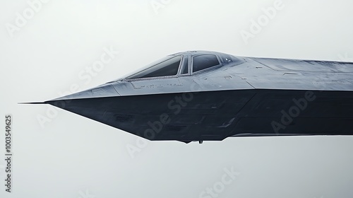stealth, bomber, nose, closeup, aircraft, military, aviation, angular, design, hazy, sky, grey, metal, sharp, line, aerodynamic, powerful, technology, warfare, air, force, defense, jet, fighter, flight, wing, cockpit, windscreen, canopy, engine, propulsion, weapon, armament, missile, missile