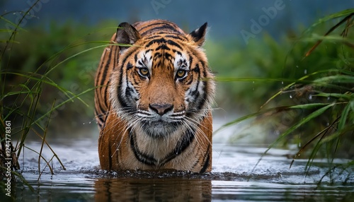 Stealthy Tiger Stalking through the Misty Wetlands in a RainSoaked Wilderness An Intense Moment of Wildlife Captured on Camera at Dawn