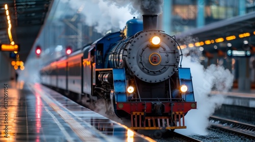 locomotive, steam, train, station, smoke, railway, transport, vintage, platform, travel, rail, engine, journey, motion, arrival, track, retro, glowing, light, blue, industrial, historic, transportation, track, urban, scene, evening, metal, power, machinery, puffing, classic, heritage, vehicle, rust, elegant, engineering, structure, dusk