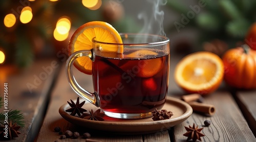 Steam rises from a glass of mulled wine garnished with orange slices, set on a rustic table with spices and pumpkins in a cozy, festive ambiance