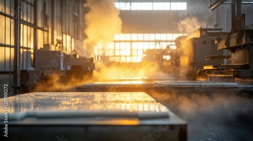 Steam rises in factory as golden sunlight streams through windows illuminating the manufacturing process.