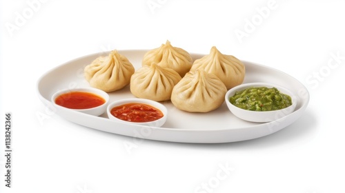 Steamed dumplings served with spicy red and green sauces on a white plate.