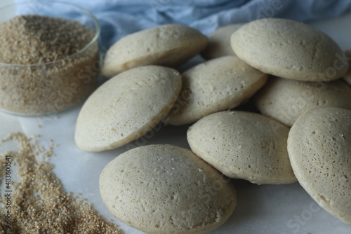 Steamed Little millet cakes or little millet idli. Made with a fermented batter of little millet, lentils. Shot with little millet in a wooden bowl