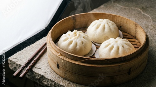Steamed Pork Baozi Buns in Bamboo Steamer Basket