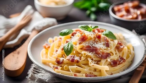 steaming bowl of authentic Italian pasta carbonara, garnished with crispy pancetta and freshly grated Parmesan cheese, a classic comfort food favorite