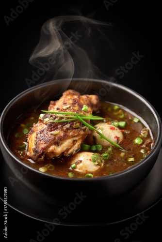 Steaming bowl of chicken and egg soup close up view on dark background gourmet food photography