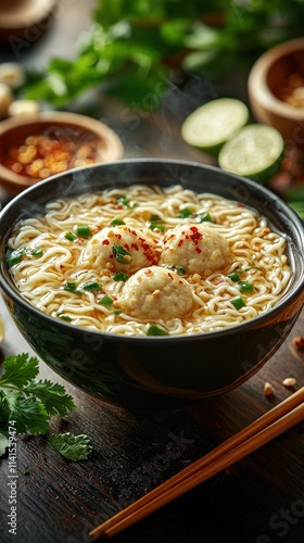 Steaming bowl of delicious noodle soup with meatball, garnished with spring onions and chili flakes, close-up shot.