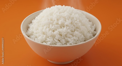 Steaming bowl of white rice on vibrant orange background for culinary design and cuisine inspiration
