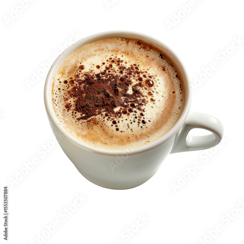 Steaming cup of coffee with frothy milk and sprinkle of cocoa on top, perfect for cozy morning