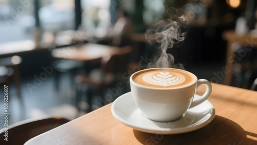 Steaming Cup of Coffee with Latte Art on a Wooden Table in a Cozy Cafe