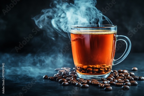 Steaming cup of dark coffee with roasted beans, moody atmospheric lighting, rich aroma.