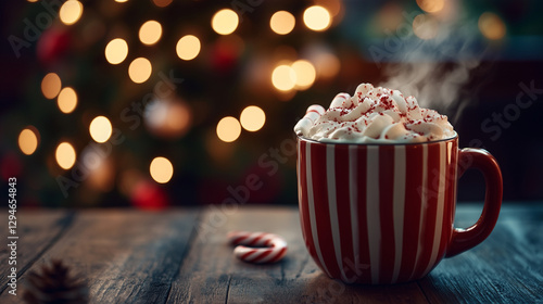 Steaming cup of peppermint mocha in a cozy Christmas setting with bokeh lights