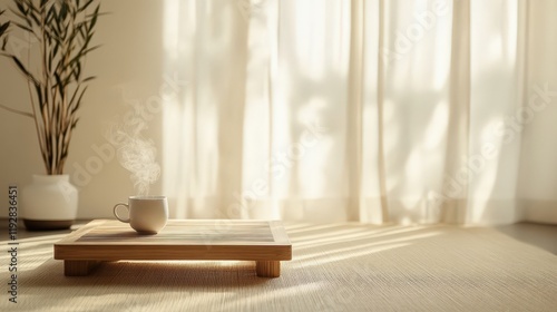 cup, steaming, tea, hot drink, warm, drink, hot, wooden, tray, bamboo, table, mat, floor, sunlight, shadow, window, curtain, light, room, interior, home, cosy, minimalist, serene, calm, peaceful, relaxing, ambience, aesthetic, simple, elegant, design, style, comfort, background, space, texture