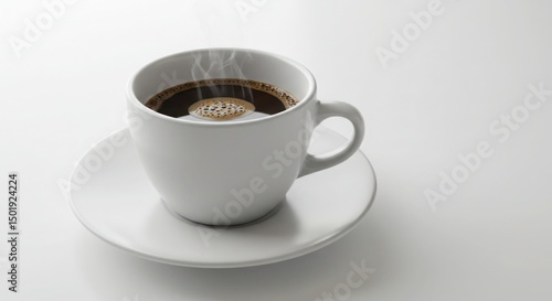 hot drink, cup, beverage, drink, caffeine, saucer, white, mug, steam, hot, dark, refreshment, porcelain, liquid, morning, breakfast, warm, aroma, cafes, espresso, cappuccino, latte, java, brew, elegant, simplicity, minimalist, clean, smooth, surface, ceramic, handle, circle, shadow, table, plate, empty, neutral, background, isolated, closeup, studio, presentation, still, life, nobody