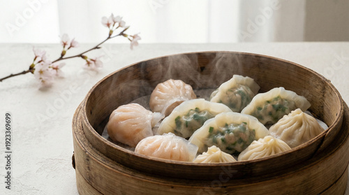 Steaming delicious dim sum dumplings in a bamboo steamer with cherry blossom background