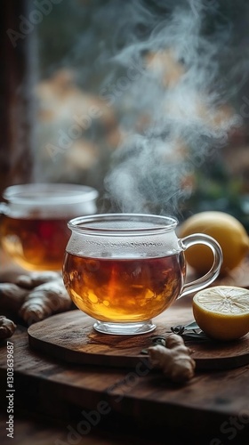 Steaming herbal tea in a glass cup with lemon and ginger on a wooden table, cozy ambiance