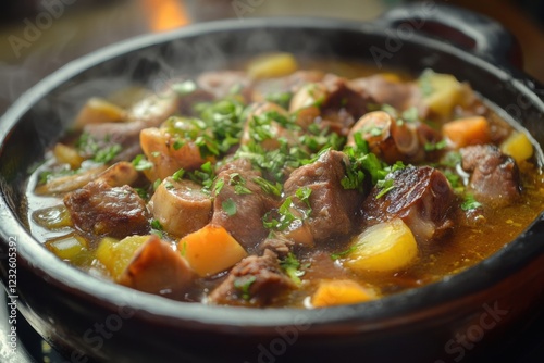 Steaming hot beef stew with potatoes, carrots, mushrooms and parsley in a traditional clay pot