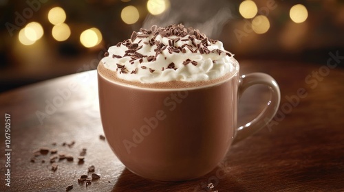 Steaming hot chocolate with whipped cream and chocolate shavings, on wooden table, festive lights background; holiday drink menu