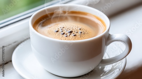 Steaming hot coffee cup with rich aroma freshly brewed morning beverage perfect warm drink experience.