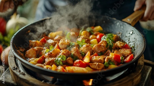 food, cooking, meal, dinner, lunch, cookery, delicious, tasty, healthy, fresh, vegetable, chicken, meat, protein, potato, tomatoes, herb, spice, stir fry, pan, cast iron, kitchen, chef, process, eatery, appetising, flavorful, aroma, steam, hot, receipe, ingredient, dish, preparation, culinary, gastronomy, eat, ravenous, deliciously, summer, autumn, winter, spring, comfort, home, warmth