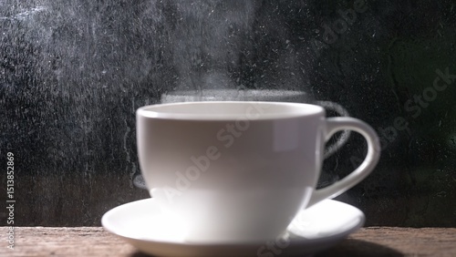 Steaming mug of Americano coffee with raindrops on window glass background, cozy beverage concept, close-up view.