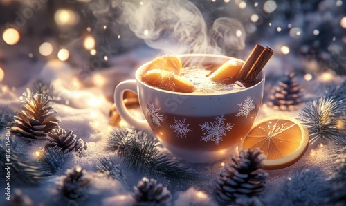 mug, hot, drink, beverage, steam, winter, warm, cosy, snow, festive, holiday, christmas, new, year, decor, pine, cone, orange, slice, cinnamon, stick, snowflake, white, brown, wood, bokeh, light, sparkle, delicious, inviting