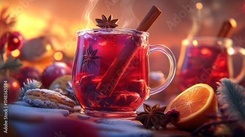 Steaming mulled wine in glass mug with cinnamon, star anise, orange, and Christmas decorations.