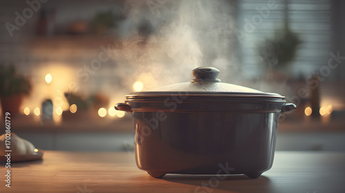 Steaming pot cooking food on kitchen table with bokeh lights in background