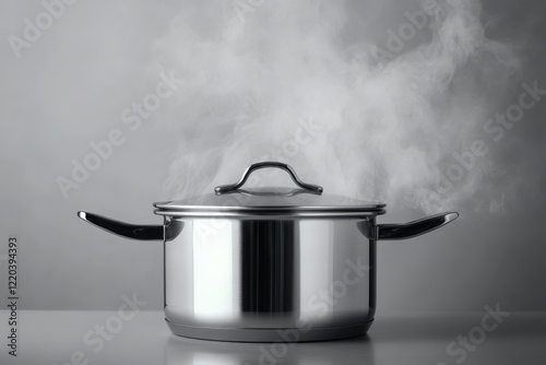 Steaming stainless steel pot cooking food on grey background