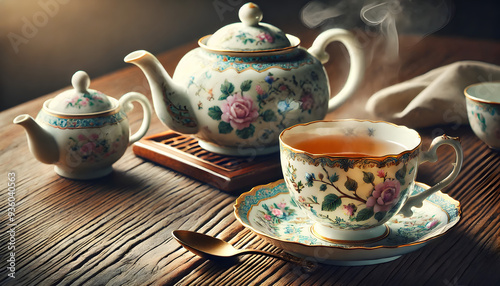 Steaming Tea in a Floral Porcelain Cup with a Matching Teapot on a Wooden Table