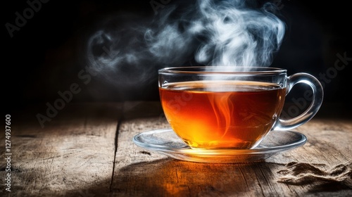 Steaming teacup on rustic wood, dark background, cozy atmosphere, perfect for beverage ads
