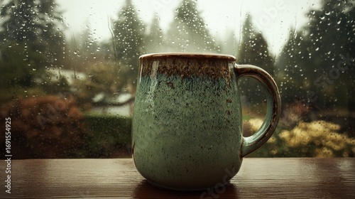 mug, ceramic, turquoise, steam, rain, window, wood, cosy, soothing, indoor, blurry, tree, droplet, rainy, day, wet, glasses, hot, beverage, drink, warmth, comfort, relaxing, still, life, quiet, tranquil, serene, peaceful, contemplative, mellow, moody, atmosphere, background, foreground, textured, surface, glaze, handle, brown, amber, table, natural, light, soft, sharpened
