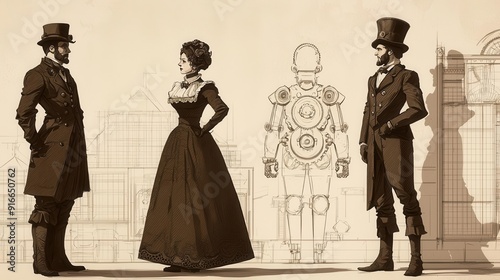 Steampunk characters in mechanical costumes, shadows cast by gears, exploring vintage attractions, sepia tones, detailed sketch