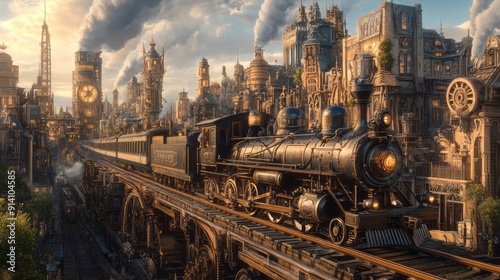 Steampunk Train Soaring Through a Futuristic Cityscape