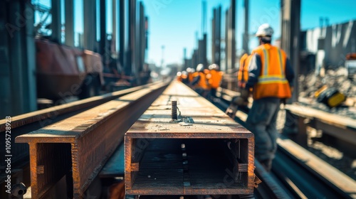 construction, site, men at work, industry, building, steel, beam, metal, iron, project, development, work, labor, engineering, infrastructure, manufacturing, factory, material, equipment, progress, safety, helmet, uniform, orange, rust-eaten, strong, heavy, material, urban, modern, architecture, design, technology, large, long, object, daylight, sunny, day, scene, view, image, photo, picture, background
