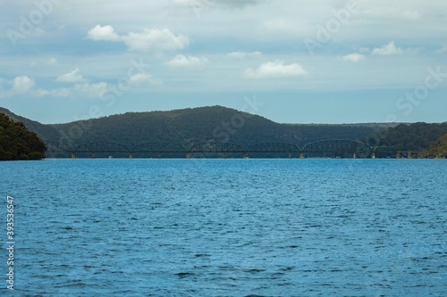Steel Railway Bridge on Hawkesbury River on Sydney Central Coast NSW Australia with green lush mountains in background