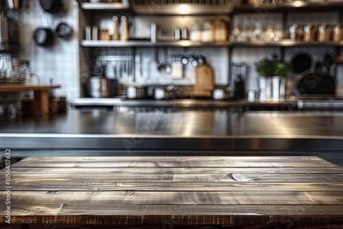 Steel Table Top for Product Display with Blurred Professional Kitchen Background Well-Lit Modern Atmosphere