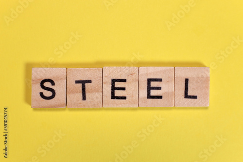 Steel word from wooden letters on yellow background