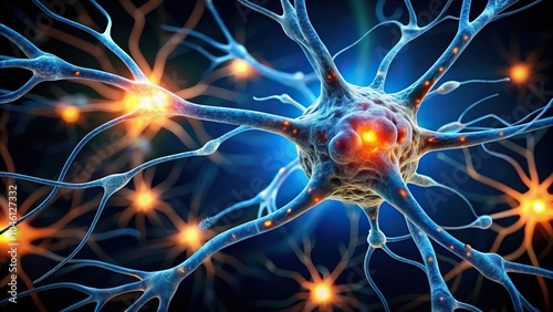 Stem cell-derived neuron firing in the brain against black background Aerial view