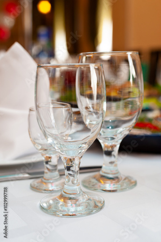 stemware, glassware, glasses, three, various, tumbler, wine, empty, plate, knife, banquet, table, laid, ready, tableware, dish, food, flatware, setting, napkin, dinner, white, silver, cold, snack, eatery, serve, dine, tablecloth, catering