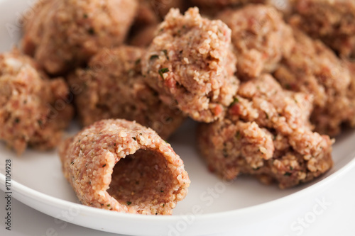 Step by step Levantine cuisine kibbeh preparation : Balls of kibbeh meat mix and one empty kibbeh
