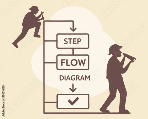 Step flow diagram illustrated with figures and a checkmark symbol on a transparent background