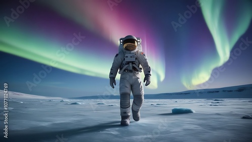 Step into an extraordinary extraterrestrial adventure with this high-resolution photograph of an astronaut walking on a frozen, alien landscape under a vivid display of Northern Lights.