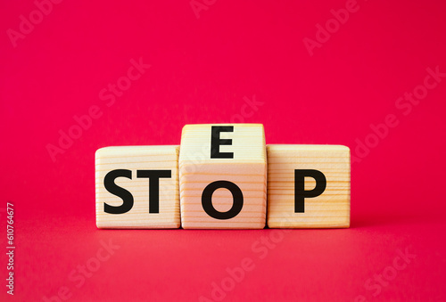 Step vs Stop symbol. Wooden cubes with words Stop and Step. Beautiful red background. Step vs Stop and business concept. Copy space