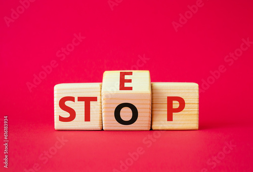 Step vs Stop symbol. Wooden cubes with words Stop and Step. Beautiful red background. Step vs Stop and business concept. Copy space