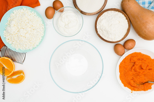 step-by-step recipe for pumpkin curd casserole in the shape of a zebra, orange autumn pie with orange. ingredients for pumpkin pie are visible from the top