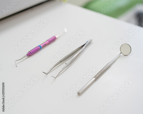 Sterile instruments lie on a table in the dentist office. A mirror, tweezers and a probe are on the doctor table. Oral hygiene, caries prevention, examination.