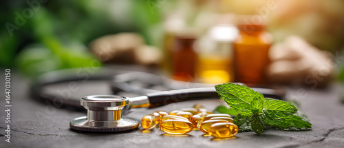 stethoscope, capsule, mint, leaf, medicine, health care, alternative, medicals, health, treatment, pharmaceutical, wellness, therapy, natural, herbal, bottle, liquid, extract, stone, surface, shiny, gold, green, plant, equipment, diagnosis, exam, pharmacy, supplement, nourishment, remedy, botanical, aromatic, fragrant, essential, oil, still, life, closeup