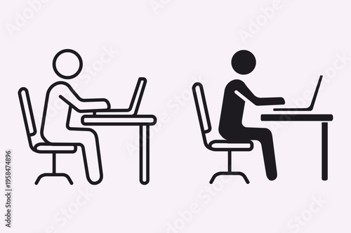 laptop, computer, working, office, business, pictogram, vector, illustration, human, silhouette, technology, outline, web design, set, workspace, productivity, freelancer, typing, screen, device, professional, office work, sitting, desk, cartoon, icon, men at work, cyberspace, person